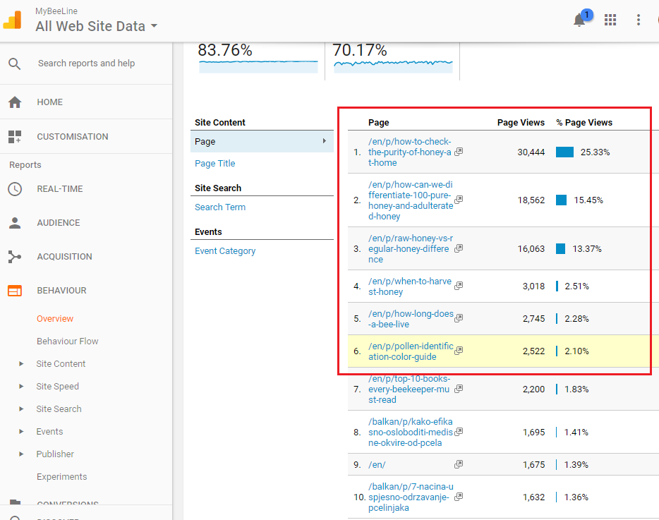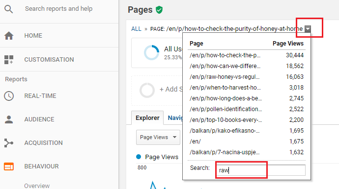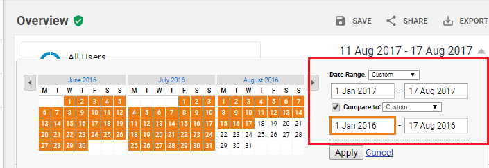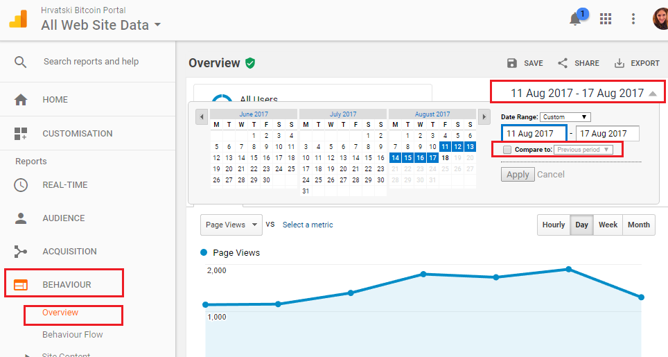 Next step is to set the period for which we want to analyze our article. So, click on the Behaviour -> Overview -> Date. Here you can also compare Date to the previous year or some other period interesting to you.