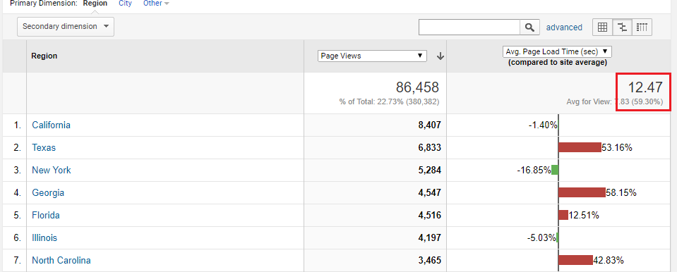 You can see that in the US our page loads more than 12 seconds (photo below) and that is a pretty bad result since our main traffic is from the US. You can check this statistic for any country and if you get a bad result (as we did), you need to fix this problem with loading page.