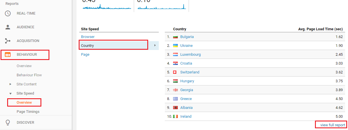 It is very important to optimize load time in countries that bring you the most visitors (we did analyze per countries in step 4 in GSC ). Also, we can check our top countries in GA, click  Behaviour -> Overview -> Country -> View Full Report and the result will be the top 10 countries that bring you the most visitors.