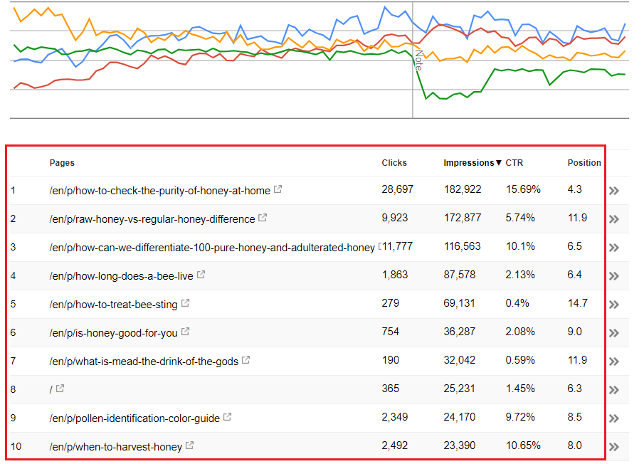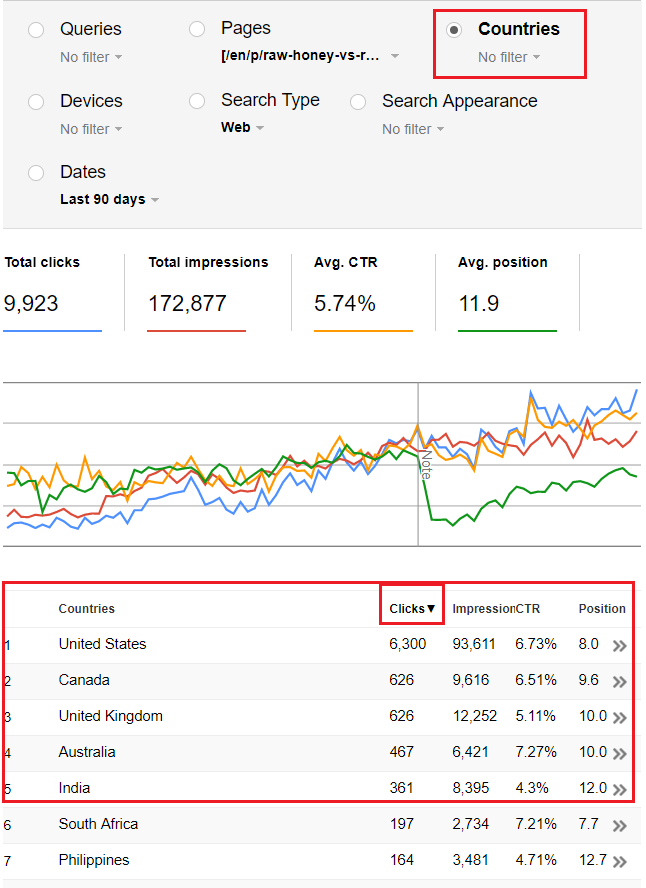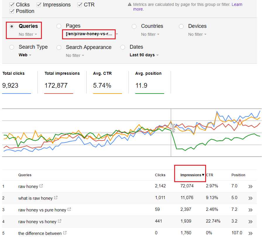 In our example, a keyword “raw honey” has impressions over 70 thousand which is pretty high, but CTR is under 3%. The main reason why CTR is not high is our position in Google result (you can see that the average position is 7).