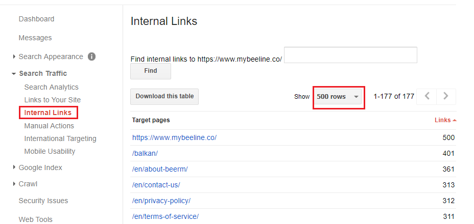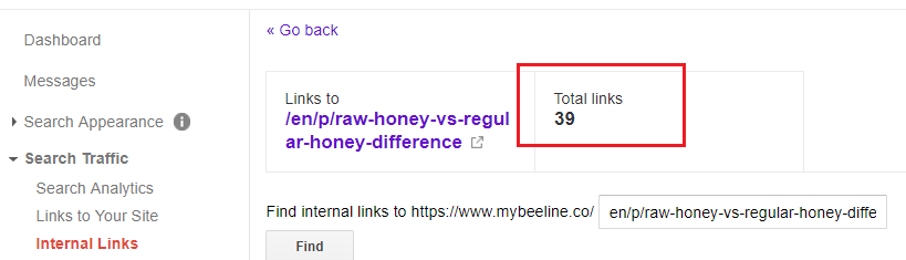 Next thing we need to check in GSC are links to our article. So, click on Internal Links->Chose to show 500 rows and find your article. To find your article press CTRl+F and type a keyword from the caption of your article (we have typed “raw”).