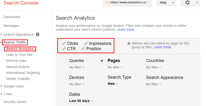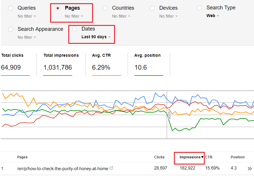 Next step is to click on Dates and select analyze Last 90 days. After that, we have to click on Pages and then click on Impressions to make a filter from highest impressions.