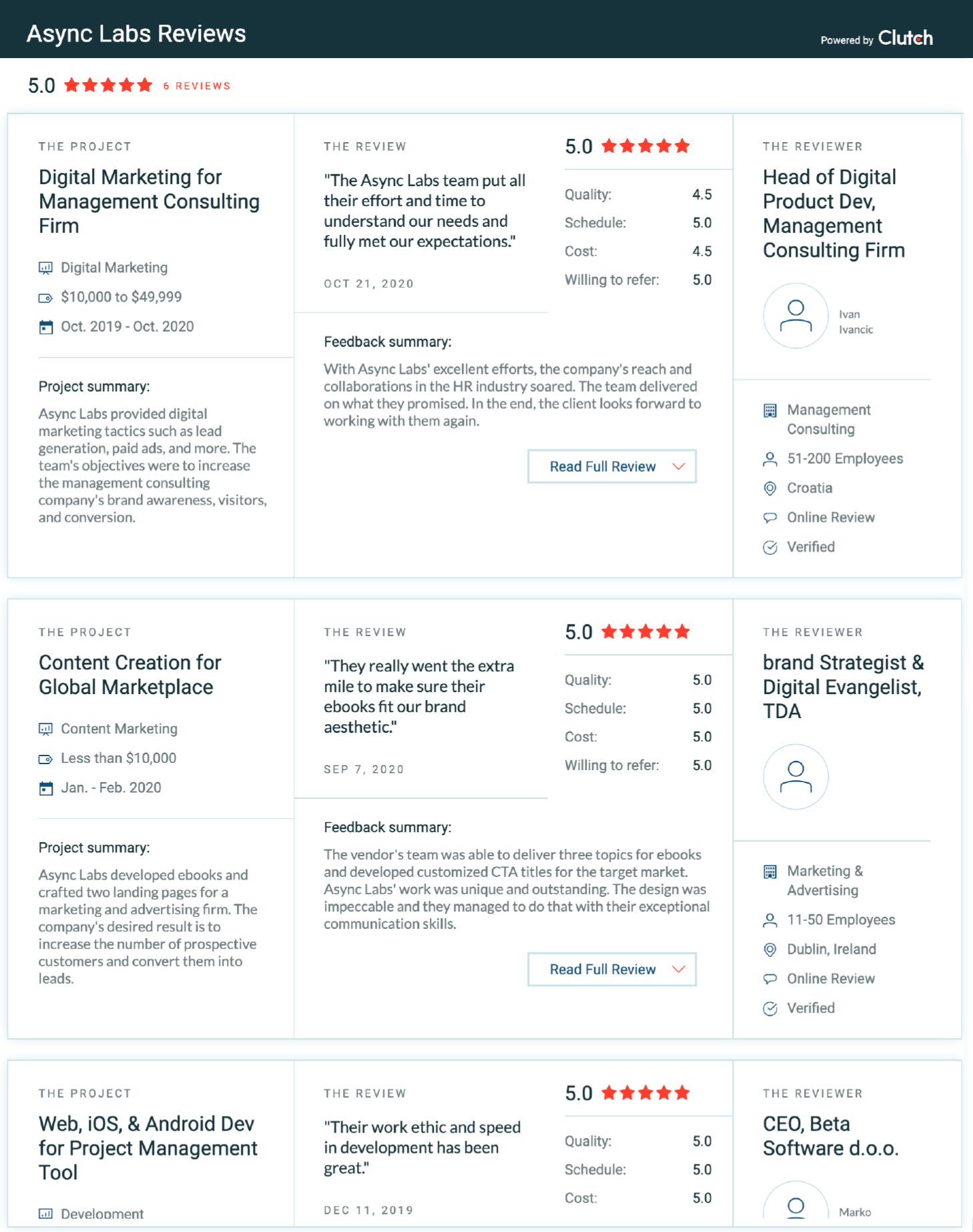 Our clients know how important a good reputation is. They always willingly rate our work and leave us their reviews. Thanks to positive reviews and ratings from our clients, the world’s preeminent ratings and reviews platform Clutch recognized us as one of the best Croatian software development agencies. We also proudly hold the Clutch award for one of the world's top companies in 2020.